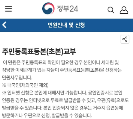 - 주민등록등본 초본 출력 ➡ 정부24 > 민원서비스 > 주민등록